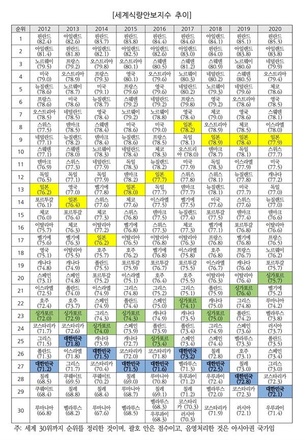 2020³â ±âÁØÀ¸·Î Çѱ¹Àº 72.1Á¡À» ¹Þ¾Æ 29À§¸¦ Â÷ÁöÇß½À´Ï´Ù. 9À§ ÀϺ»À̳ª 20À§ ½Ì°¡Æ÷¸£º¸´Ù ´õ ³·Àº ¼øÀ§À̸ç, 30À§ ±Ç³» ±¹°¡µéÀÌ ´ëºÎºÐ OECD °¡ÀÔ±¹°¡ÀÓÀ» °¨¾ÈÇßÀ» ¶§ ¿ì¸®³ª¶óÀÇ ½Ä·®¾Èº¸Áö¼ö´Â OECD °¡ÀÔ±¹ Áß ÃÖÇÏÀ§ ¼öÁØÀÔ´Ï´Ù.