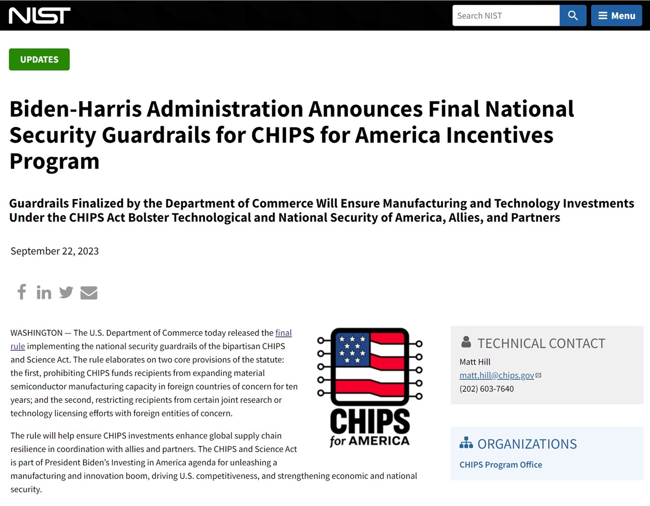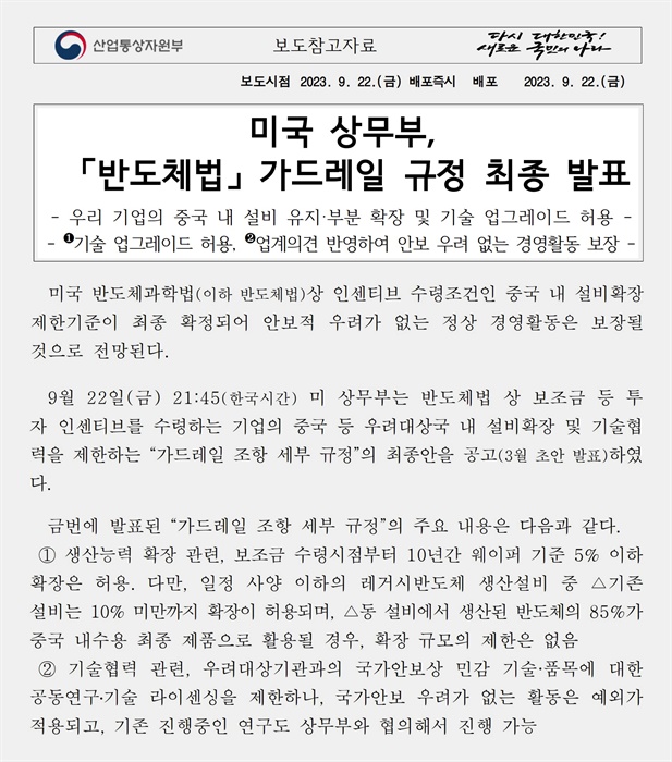 (¼¿ï=¿À¸¶ÀÌ´º½º) À̺À·Ä ±âÀÚ = ¿À´ÃÀº »ê¾÷Åë»óÀÚ¿øºÎ(»êÀÚºÎ)ÀÇ ¹ÝµµÃ¼ °ü·Ã º¸µµÀÚ·á Çϳª¸¦ ´ëÅë·É´Ô¿¡°Ô ¼³¸íÇÏ´Â ½Ã°£À» °®µµ·Ï ÇϰڽÀ´Ï´Ù. Áö³ 22ÀÏ ¹Ì±¹ »ó¹«ºÎ´Â ¹ÝµµÃ¼¹ý(CHIPS and Science Act) °¡µå·¹ÀÏ ±ÔÁ¤À» ÃÖÁ¾ ¹ßÇ¥Çß½À´Ï´Ù. ÀÌ ¹ßÇ¥¸¦ »êÀںΰ¡ ¹Þ¾Æ¼ "¹Ì±¹ »ó¹«ºÎ, ¡¸¹ÝµµÃ¼¹ý¡¹ °¡µå·¹ÀÏ ±ÔÁ¤ ÃÖÁ¾ ¹ßÇ¥"¶ó´Â Á¦¸ñÀÇ º¸µµÂü°íÀڷḦ ¹èÆ÷Çß½À´Ï´Ù.