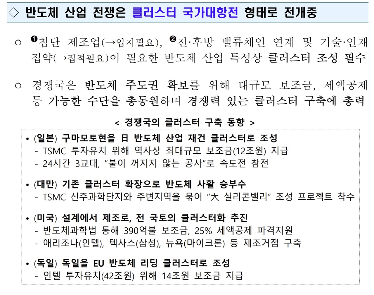 »ê¾÷ºÎ´Â º¸µµÀÚ·á¿¡¼ "¹ÝµµÃ¼ »ê¾÷ ÀüÀïÀº Ŭ·¯½ºÅÍ ±¹°¡´ëÇ×Àü ÇüÅ·ΠÀü°³ Áß"À̶ó¸ç ¿ì¸®µµ Ŭ·¯½ºÅÍ¿¡ ´Ù ²ø¾î¸ð¾Æ¾ß ÇÑ´Ù°í ÁÖÀåÇß½À´Ï´Ù. ±×·¯¸é¼ ÀϺ», ´ë¸¸, ¹Ì±¹, µ¶ÀÏ µîÀ» »ç·Ê·Î µé¾ú½À´Ï´Ù. °ú¿¬ ±×µéÀÌ ¹ÝµµÃ¼ ÆÕ°ú ¿¬°ü »ê¾÷µéÀ» ÇÑ ±ºµ¥¿¡ ´Ù ¸ô¾Æ³Ö¾î¼ Ŭ·¯½ºÅ͸¦ ¸¸µé°í ÀÖÀ»±î¿ä?