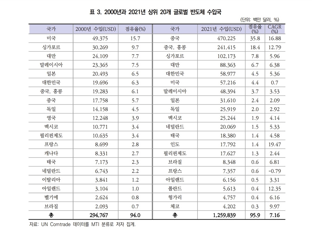 ¡ã 2000³â°ú 2021³â »óÀ§ 20°³ ±Û·Î¹ú ¹ÝµµÃ¼ ¼öÀÔ±¹. 20³â Àü¿¡´Â ¹Ì±¹ÀÌ 1À§¿´Áö¸¸ 2021³âÀº Áß±¹ÀÌ ¾ÐµµÀû 1À§ÀÔ´Ï´Ù. ¨Ï ´ë¿Ü°æÁ¦Á¤Ã¥¿¬±¸¿ø