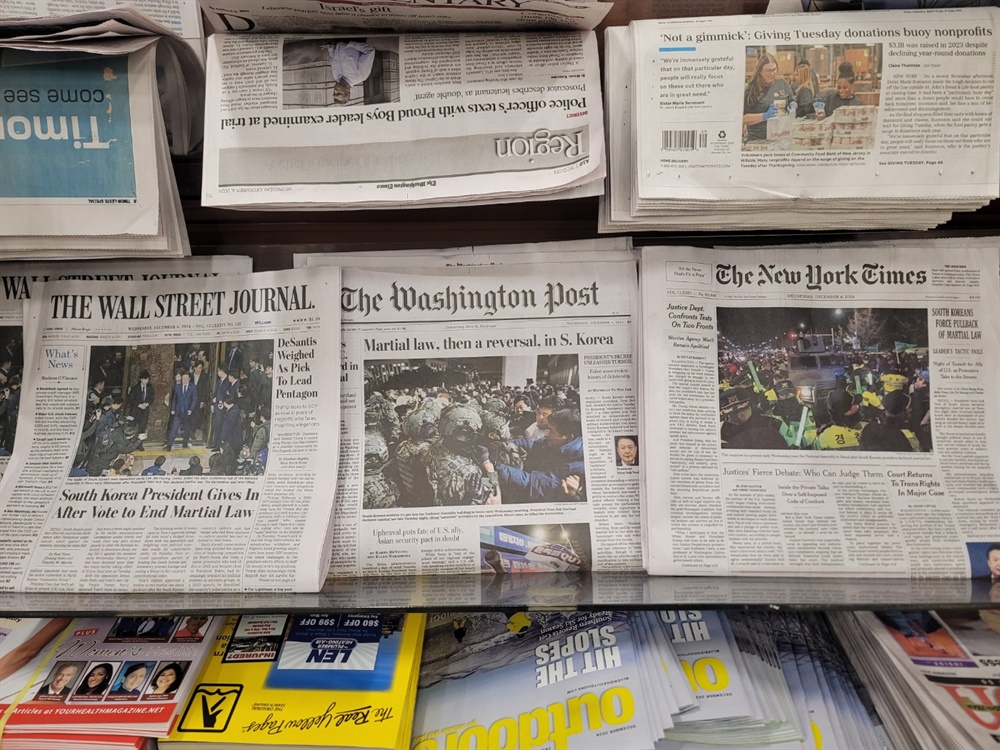 ¡ãÀ±¼®¿ ´ëÅë·ÉÀÇ ºñ»ó°è¾ö ¼±Æ÷¿Í ±¹È¸ °áÀÇ¿¡ µû¸¥ ÇØÁ¦´Â ¹Ì±¹ ¾ð·Ð¿¡¼µµ ÁÖ¿ä ´º½º·Î ´Ù·ïÁ³´Ù. 4ÀÏ(ÇöÁö½Ã°£) ¹Ì±¹ ¹öÁö´Ï¾ÆÁÖÀÇ ÇÑ ¸¶Æ® ½Å¹® °¡ÆÇ´ë¿¡ À̳¯ÀÚ 1¸é ¸Ó¸´±â»ç¿Í »çÁøÀ¸·Î Çѱ¹ °è¾ö »çŸ¦ ´Ù·é ¿ù½ºÆ®¸®Æ®Àú³Î(WSJ•¿ÞÂʺÎÅÍ), ¿ö½ÌÅÏÆ÷½ºÆ®(WP), ´º¿åŸÀÓ½º(NYT) µîÀÌ Áø¿µÅ ÀÖ´Ù. ¨Ï¿¬ÇÕ´º½º
