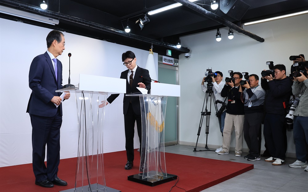 8ÀÏ ÇÑ´ö¼ö ±¹¹«ÃѸ®¿Í Çѵ¿ÈÆ ±¹¹ÎÀÇÈû ´ëÇ¥´Â °øµ¿ ´ãȹ®À» ÅëÇØ ºñ»ó°è¾ö ¼±Æ÷ÀÇ ¹ÝÇå¹ý¼ºÀ» ÀÎÁ¤Çß´Ù. ´çÃÊ 'Áú¼ ÀÖ´Â ÅðÁø'À» ¸íºÐÀ¸·Î źÇÙ¾È ºÎ°áÀ» ÁÖµµÇß´ø ¿©´çÀÌ, ÀÌÁ¦´Â ±¹¹Î¿¡ ÀÇÇØ ¼±ÃâµÇÁö ¾ÊÀº ´ç ´ëÇ¥¸¦ ÅëÇÑ ´çÁ¤ ¼·Á¤ üÁ¦ ¼ö¸³À» ¼±¾ðÇÏ°í ³ª¼¹´Ù.