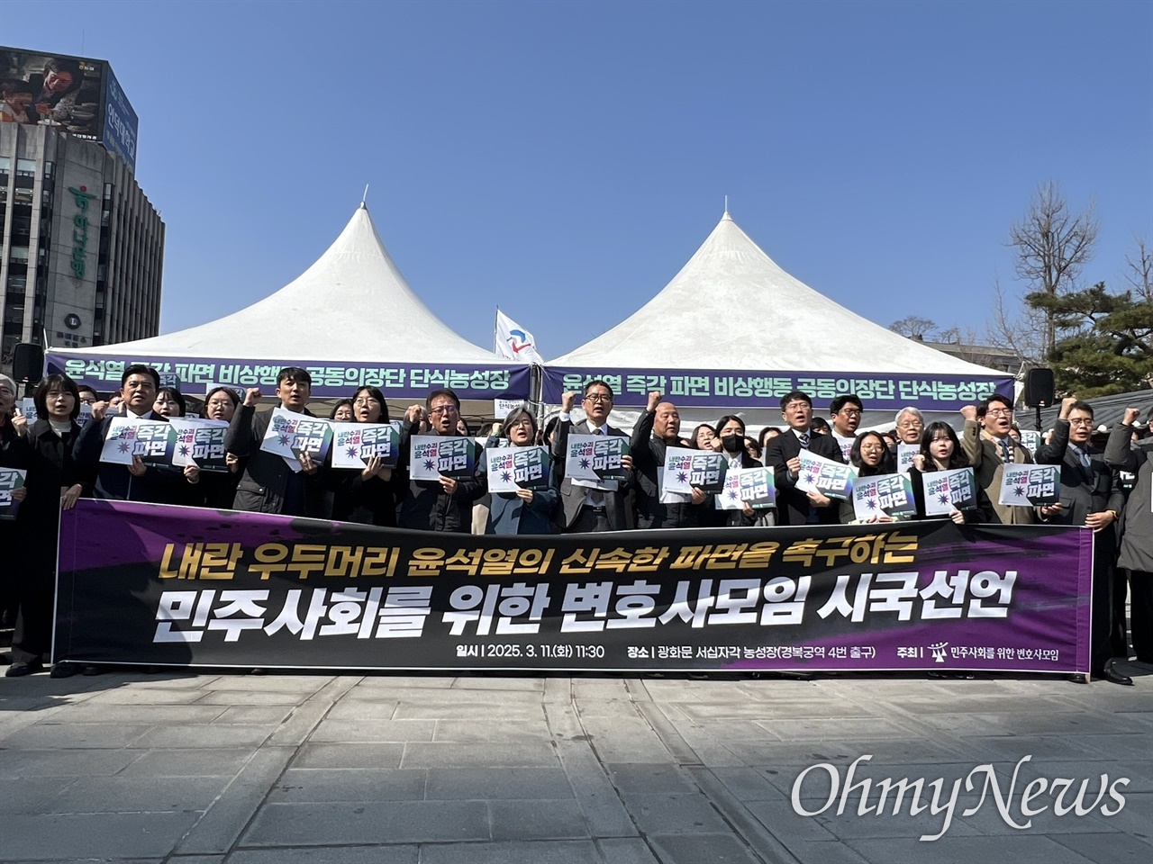 ¡ã¹ÎÁÖ»çȸ¸¦À§ÇѺ¯È£»ç¸ðÀÓ(¹Îº¯)ÀÌ 11ÀÏ ¿ÀÀü 11½Ã 30ºÐ ¼¿ï ±¤È¹® ¼½ÊÀÚ°¢ ºñ»óÇൿ °øµ¿ÀÇÀå´Ü ´Ü½Ä³ó¼ºÀå ¾Õ¿¡¼ '³»¶õ ¿ìµÎ¸Ó¸® À±¼®¿ÀÇ ½Å¼ÓÇÑ ÆÄ¸éÀ» Ã˱¸ÇÏ´Â ¹ÎÁÖ»çȸ¸¦ À§ÇÑ º¯È£»ç¸ðÀÓ ½Ã±¹¼±¾ð'À» ¿¾ú´Ù. À̳¯ ¹Îº¯ º¯È£»ç 90¿© ¸íÀÌ ½Ã±¹¼±¾ð¿¡ Âü¼®Çß´Ù. ¨Ï À¯Áö¿µ