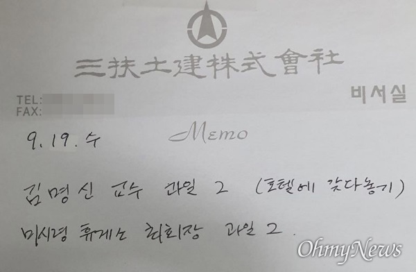 ¡ãÁ¶³²¿í ȸÀå ºñ¼½ÇÀÇ ¸Þ¸ðÀå. '±è¸í½Å ±³¼ö'´Â ±è°ÇÈñ¸¦, '¹Ì½Ã·É ÈÞ°Ô¼Ò ÃÖ È¸Àå'Àº À±¼®¿ Àå¸ð ÃÖÀº¼øÀ» ¶æÇÑ´Ù. ¸íÀý ¼±¹°¿¡ ´ëÇÑ ¸Þ¸ðÀε¥ ±è°ÇÈñ¿¡ ´ëÇØ¼¸¸ "È£ÅÚ¿¡ °®´Ù ³õ±â"¶ó°í ÀûÀº °Ô Èï¹Ì·Ó´Ù. ¨Ï ¿À¸¶ÀÌ´º½º