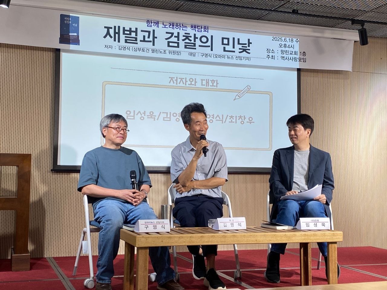 ¡ãÁö³ 6¿ù 18ÀÏ Ç⸰±³È¸¿¡¼ ¿¸° <Àç¹ú°ú °ËÂûÀÇ ¹Î³¸> Ã¥´ãȸ. ÀúÀÚÀÎ ±è¿µ¼® À§¿øÀå(»çÁø °¡¿îµ¥)ÀÌ Ã¥ ³»¿ë¿¡ ´ëÇØ ¹ß¾ðÇϰí ÀÖ´Ù. ¨Ï ¿ª»ç»ç¶û¸ðÀÓ Á¦°ø
