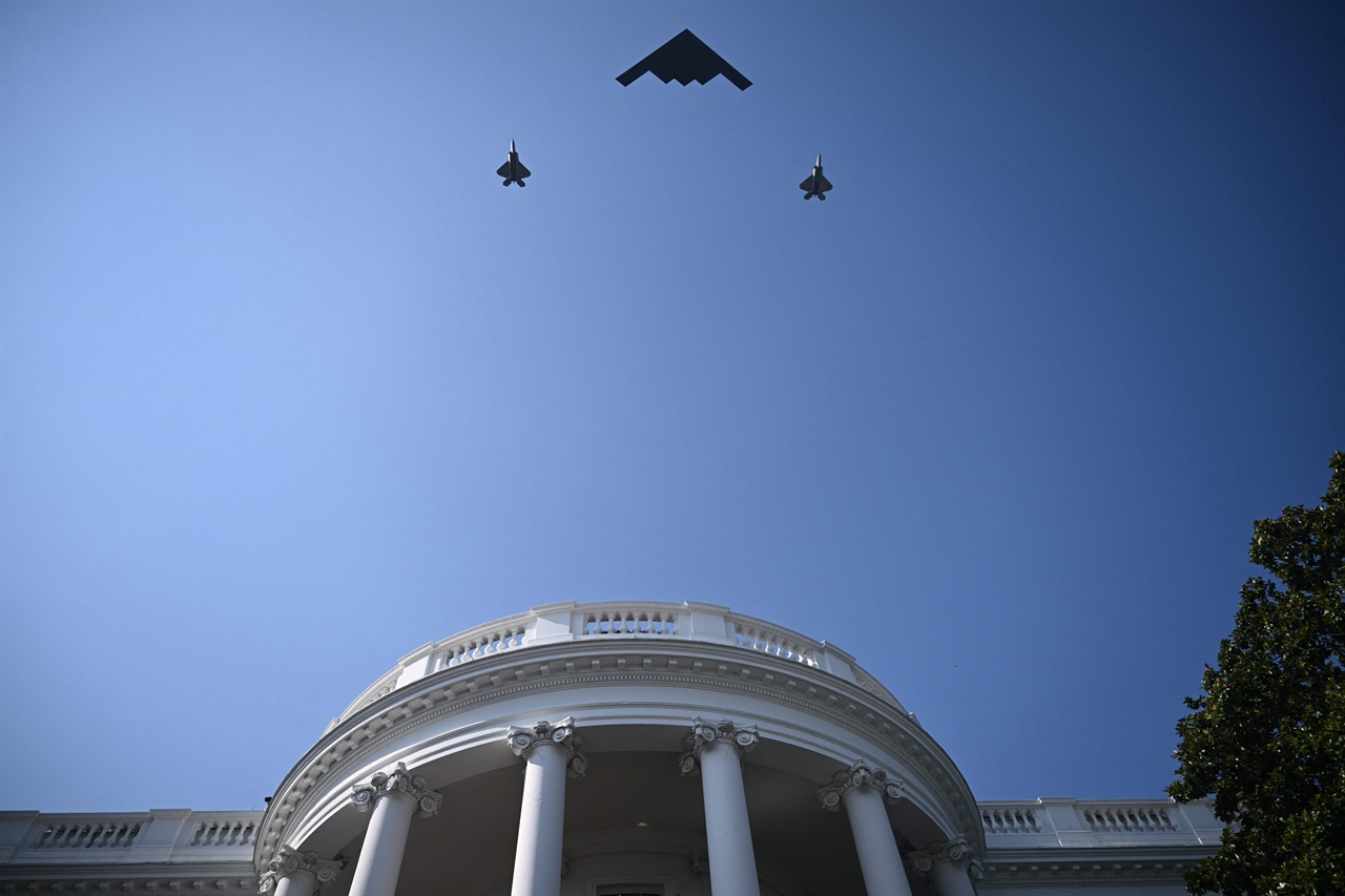 ¡ãÁö³ 4ÀÏ ÀüÅõ±â 2´ëÀÇ È£À§¸¦ ¹Þ´Â B-2 Àü·« Æø°Ý±â°¡ ¹é¾Ç°ü »ó°øÀ» ºñÇàÇϰí ÀÖ´Â ¸ð½À. B-2 Àü·« Æø°Ý±â´Â À̶õÀ» »ó´ë·Î ¹úÀÎ 'ÇѹãÀÇ ¸ÁÄ¡(Midnight hammer) ÀÛÀü'¿¡µµ Ȱ¿ëµÆ´Ù. ¨ÏAFP/¿¬ÇÕ´º½º