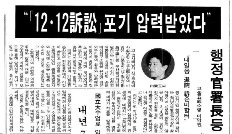¡ã1990³â 12¿ù 21ÀÏ ÀÚ <µ¿¾ÆÀϺ¸> ±â»ç '12.12áÍáè(¼Ò¼Û)Æ÷±â ¾Ð·Â¹Þ¾Ò´Ù'¿¡ ¹é¿µ¿Á¾¾°¡ ½Å±ººÎ·ÎºÎÅÍ ¹ÞÀº ¾Ð¹Ú ¹× ȸÀ¯ÀÇ ³»¿ëÀÌ ¼Ò°³µÆ´Ù. ¨Ï³×À̹ö ´º½º ¶óÀ̺귯¸®