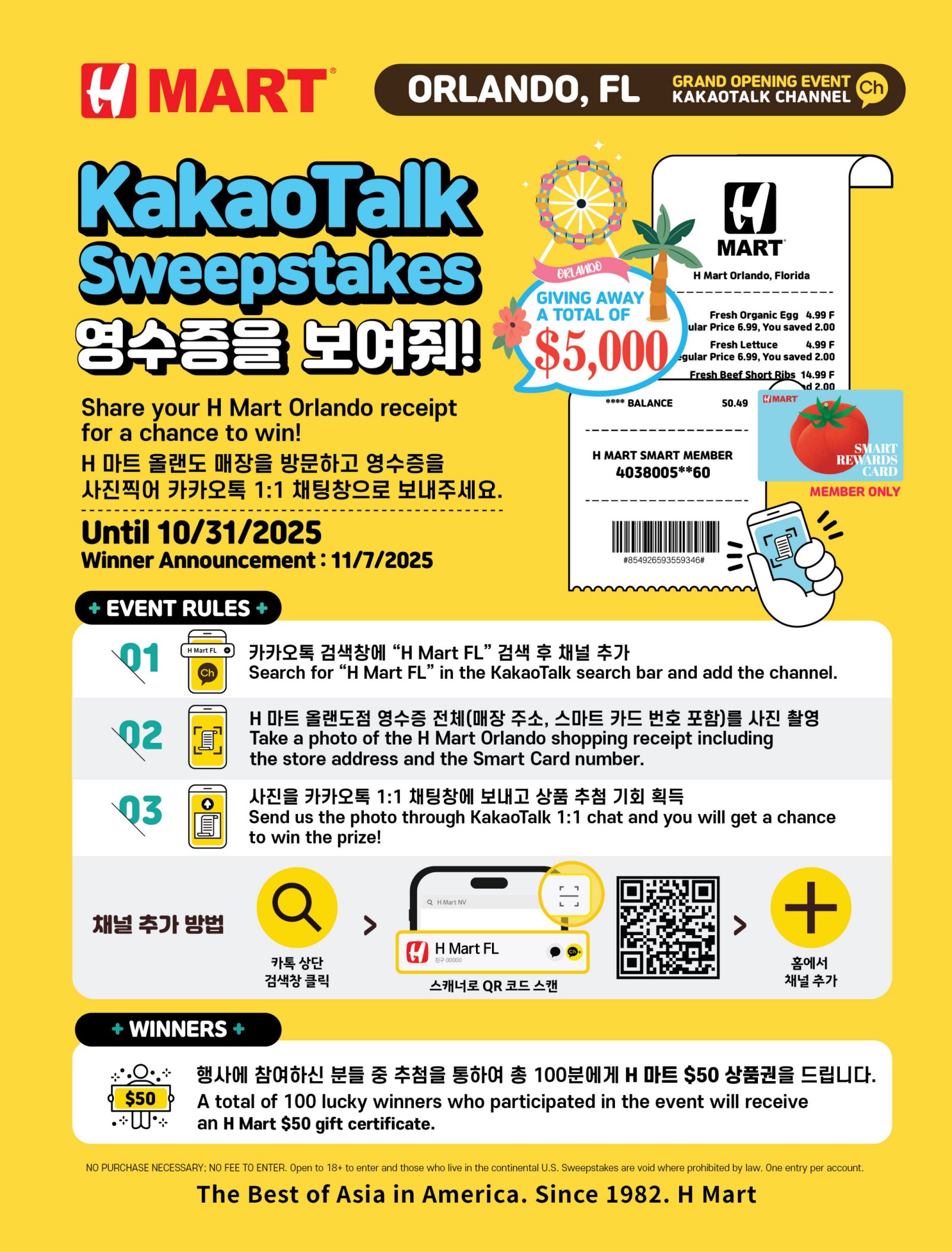 À̹ø À̺¥Æ®´Â H ¸¶Æ® ½º¸¶Æ®Ä«µå ȸ¿ø Áß Ä«Ä«¿ÀÅå ä³ÎÀ» Ãß°¡ÇÑ °í°´À» ´ë»óÀ¸·Î ÇÑ´Ù. Âü¿© ¹æ¹ýÀº °£´ÜÇÏ´Ù. īī¿ÀÅå °Ë»öâ¿¡ ¡®H Mart FL¡¯À» ÀÔ·ÂÇØ ä³ÎÀ» Ãß°¡ÇÑ µÚ, ¿Ã·£µµÁ¡¿¡¼ »óǰÀ» ±¸¸ÅÇÑ ¿µ¼öÁõÀ» ½º¸¶Æ®ÆùÀ¸·Î ÃÔ¿µÇØ 1:1 äÆÃâÀ¸·Î Àü¼ÛÇÏ¸é µÈ´Ù. ´Ü, Àü¼ÛÇÑ ¿µ¼öÁõ¿¡´Â ½º¸¶Æ®Ä«µå ¹øÈ£°¡ ÇÔ²² ÂïÇô ÀÖ¾î¾ß ÇÑ´Ù.