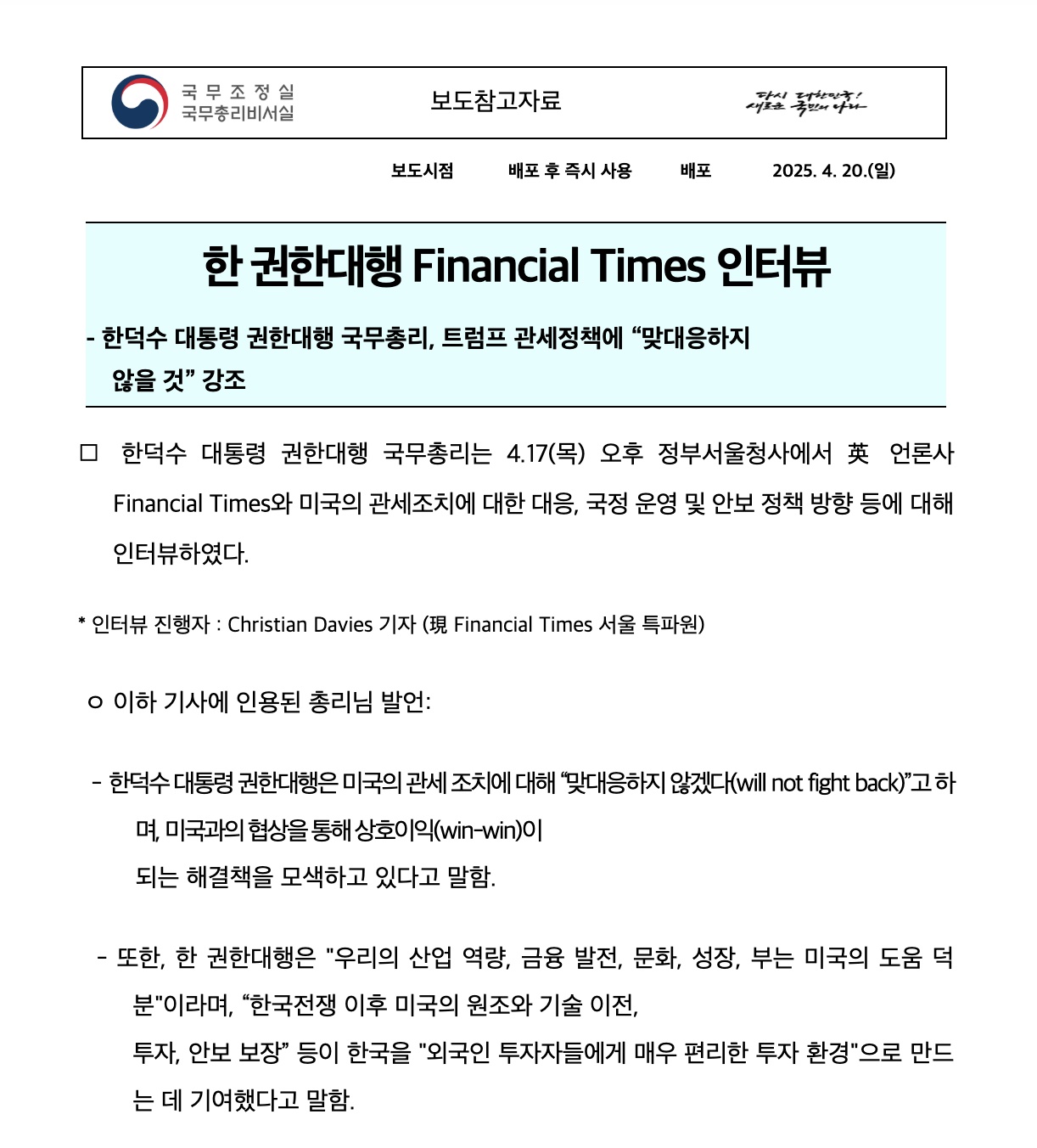 ÇÑ¹Ì °ü¼¼ Çù»ó¿¡ ´ëÇØ °¡Àå ¸ÕÀú ÀÇ¹Ì ÀÖ´Â ÀÎÅͺ並 ÇÑ »ç¶÷Àº ÀÌÀç¸í Á¤ºÎÀÇ Àλ簡 ¾Æ´Õ´Ï´Ù. Áö³­ 4¿ù 17ÀÏ ´ç½Ã ÇÑ´ö¼ö ´ëÅë·É ±ÇÇÑ´ëÇàÀÔ´Ï´Ù. ±î¸¶µæÇÑ ¿¾³¯ °°Áö¸¸ ºÒ°ú 5´Þ ÀüÀÔ´Ï´Ù. ±×°¡ ÀÎÅͺäÇÑ ¿µ±¹ÀÇ <ÆÄÀ̳½¼ÈŸÀÓ½º>´Â 130³â ³Ñ´Â ¿ª»ç¸¦ ÀÚ¶ûÇÏ´Â ¿µ¹Ì ÀÚº»ÁÖÀÇÀÇ ´ëÇ¥ ½Å¹®»çÁö¿ä.