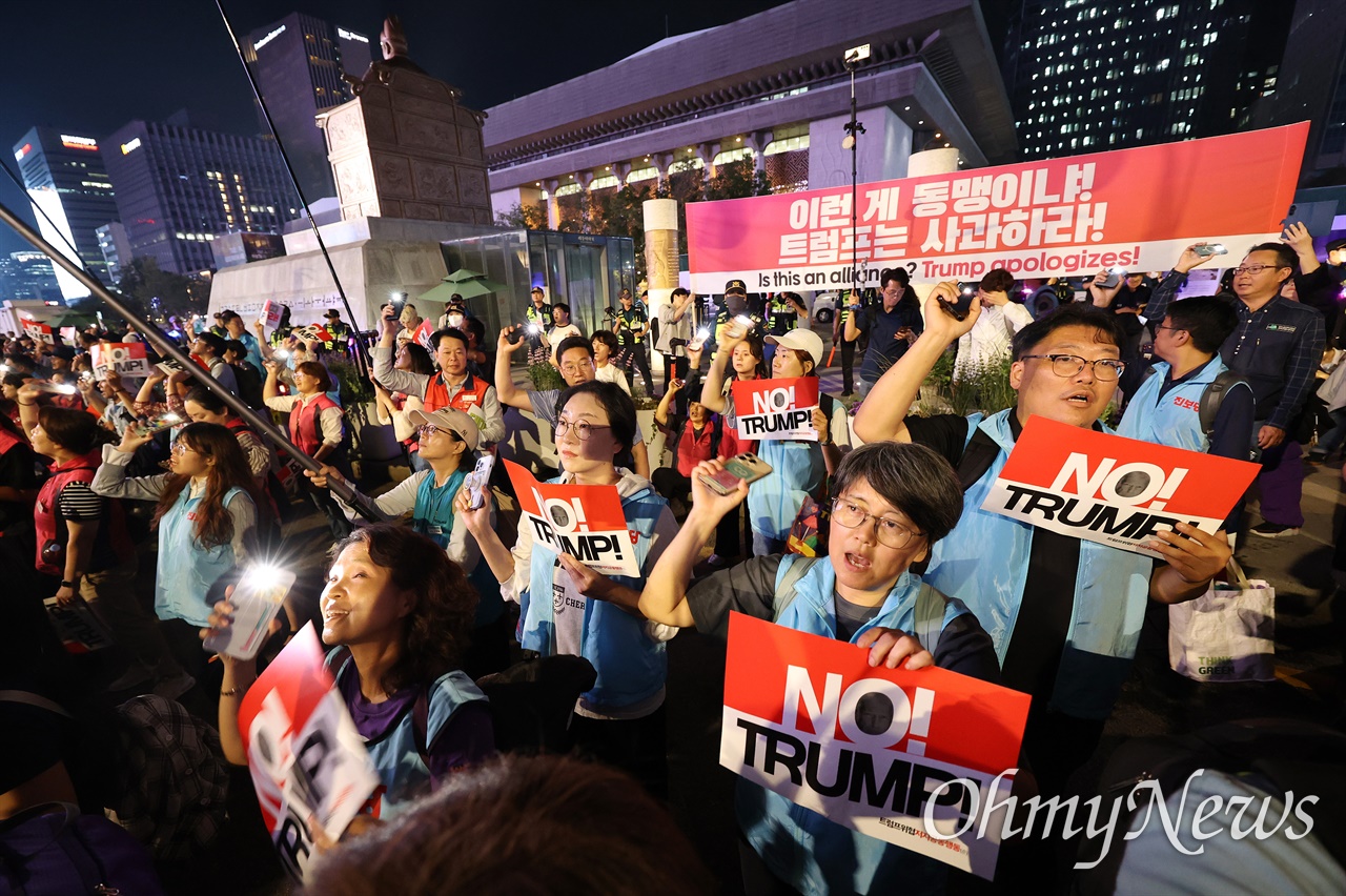¡ãÆ®·³ÇÁÀ§ÇùÀúÁö°øµ¿Çൿ ¼Ò¼Ó ¹ÎÁÖ³ëÃÑ, Áøº¸´ç µî Á¤´ç½Ã¹Î»çȸ´Üü ȸ¿øµéÀÌ 26ÀÏ ¿ÀÈÄ ¼­¿ï ±¤È­¹®³×°Å¸®¿¡¼­ Áýȸ¸¦ ¿­¾î Çѱ¹³ëµ¿ÀÚ ±¸±Ý°ú ÀαÇÀ¯¸°À» ±ÔźÇϰí, Æ®·³ÇÁ ´ëÅë·É »ç°ú, °ü¼¼Çù¹Ú Áß´Ü, ´ë¹ÌÅõÀÚ Ã¶È¸ µîÀ» Ã˱¸ÇÏ¸ç ¹Ì±¹´ë»ç°ü¾Õ±îÁö ÇàÁøÀ» ¹ú¿´´Ù. ¨Ï±Ç¿ì¼º
