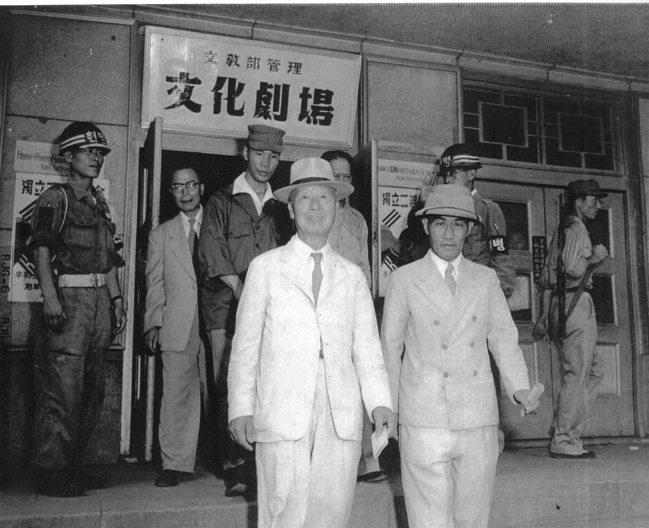 ¡ã1950³â 8¿ù 15ÀÏ °æºÏ ´ë±¸¿¡¼ À̽¸¸ ´ëÅë·É°ú ½Å¼º¸ð ±¹¹æÀå°üÀÌ 8.15 °æÃà½ÄÀ» ¸¶Ä¡°í Àӽà ±¹È¸ÀÇ»ç´çÀ¸·Î »ç¿ëÇÏ´ø ¹®È±ØÀåÀ» ¶°³ª°í ÀÖ´Ù. ¨ÏNARA