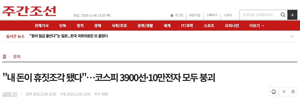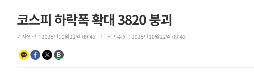 ¾Æ·¡ <´º½ºÇË> ±â»ç´Â ÄÚ½ºÇÇ Ç϶ôÆøÀÌ È®´ëµÇ¸ç ÀåÁß 3820¼±ÀÌ ºØ±«µÆ´Ù°í Ç¥ÇöÇÑ´Ù. ÄÚ½ºÇÇ 4000¼±ÀÌ ºØ±«µÆ´Ù´Â Ç¥ÇöÀº ±×³ª¸¶ ¾î»öÇÏÁö¶óµµ ¾Ê´Ù. ±×·¯³ª ÄÚ½ºÇÇ 3820¼±ÀÌ ºØ±«µÆ´Ù¸é, 3810¼±µµ, 3790¼±µµ ºØ±«µÇ¾î¾ß ÇÑ´Ù. ±×·¯´Ï±î ÆÛ¼¾Æ¼Áö·Î µûÁö¸é ÁÖ°¡Áö¼ö°¡ 0.2% Á¤µµ¸¸ ¶³¾îÁ®µµ, ¸Å 10´ÜÀ§·Î ÁÖ°¡Áö¼ö°¡ ºØ±«Çϰí ÀÖ´Ù´Â °ÍÀÌ´Ù. ÁÖ°¡Áö¼ö°¡ 0.2% ¶³¾îÁö¸é ÁֽĽÃÀåÀÌ ¹«³ÊÁö°í, ³»·Á¾É°í, Çã¹°¾îÁ®¼ ¸ÁÇØ¹ö¸± °Í °°´Ù´Â '´À³¦'À» Àü´ÞÇÏ´Â ¾ð·ÐÀ̶ó´Ï¡¦