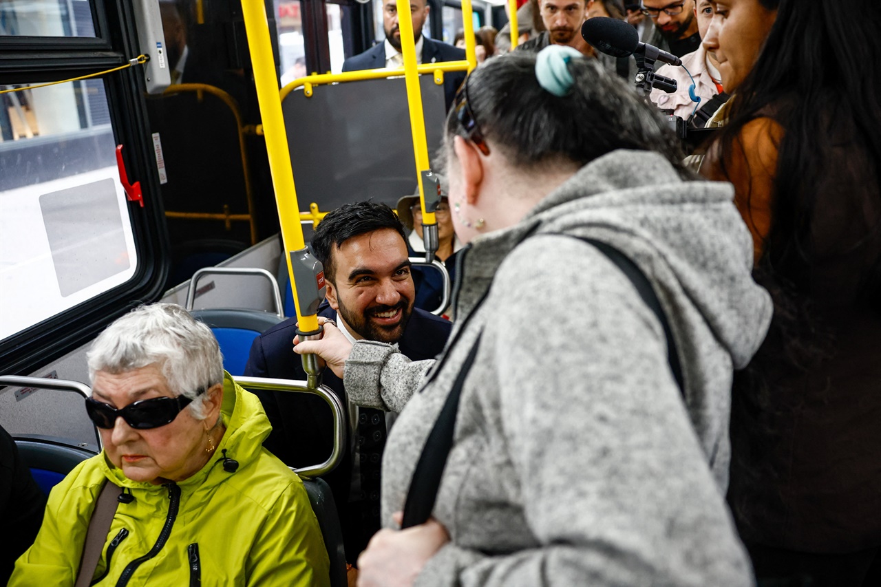 ¡ãÁö³ 10¿ù 8ÀÏ ¹Ì±¹ ´º¿å½Ã¿¡¼ ´º¿å ½ÃÀå Èĺ¸ Á¶¶õ ¸¾´Ù´Ï°¡ ¹«·á °í¼Ó ¹ö½º µµÀÔ Á¦¾È °ü·Ã ±âÀÚȸ°ß¿¡ Âü¼®Çϱâ À§ÇØ M57¹ø ¹ö½º¸¦ Ÿ°í À̵¿ Áß ½Â°´°ú ´ëÈÇϰí ÀÖ´Ù. ¨Ï·ÎÀÌÅÍ/¿¬ÇÕ´º½º