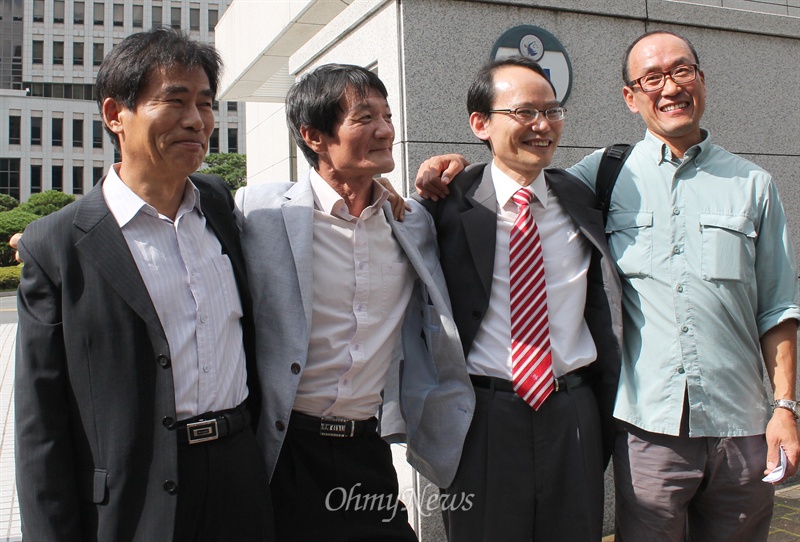 ¡ã2014³â 9¿ù 25ÀÏ ´ë¹ý¿ø¿¡¼ ¹«ÁË ÆÇ°áÀ» ¹ÞÀº ºÎ¸²»ç°Ç ÇÇÇØÀÚµéÀÌ ºÎ»êÁö¹æ¹ý¿ø ¾Õ¿¡¼ ¾î±úµ¿¹«¸¦ ÇÏ°í ¿ô°í ÀÖ´Ù. ¿À¸¥ÂʺÎÅÍ ÀÌÁø°É, °íÈ£¼®, ¼³µ¿ÀÏ, ÃÖÁØ¿µ¾¾. ¨Ï Á¤¹Î±Ô