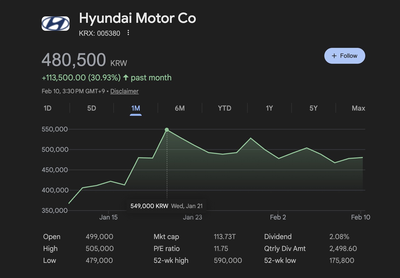 ¡ã¾ÆÆ²¶ó½º ¹ßÇ¥ ÀÌÈÄ ÇÑ ´Þ°£ Çö´ëÀÚµ¿Â÷ ÁÖ°¡ ÃßÀÌ. 1¿ù 21ÀÏ Á¤Á¡À» ÂïÀº µÚ Á¶Á¤ ±¹¸é¿¡ ÁøÀÔÇÑ ¸ð½ÀÀ¸·Î, ºñÀü ¹ßÇ¥¿¡ ´ëÇÑ ±â´ë¿Í ½ÇÀû µÐȶó´Â Çö½ÇÀÌ µ¿½Ã¿¡ ¹Ý¿µµÅ ÀÖ´Ù. ¨ÏGoogle ĸó