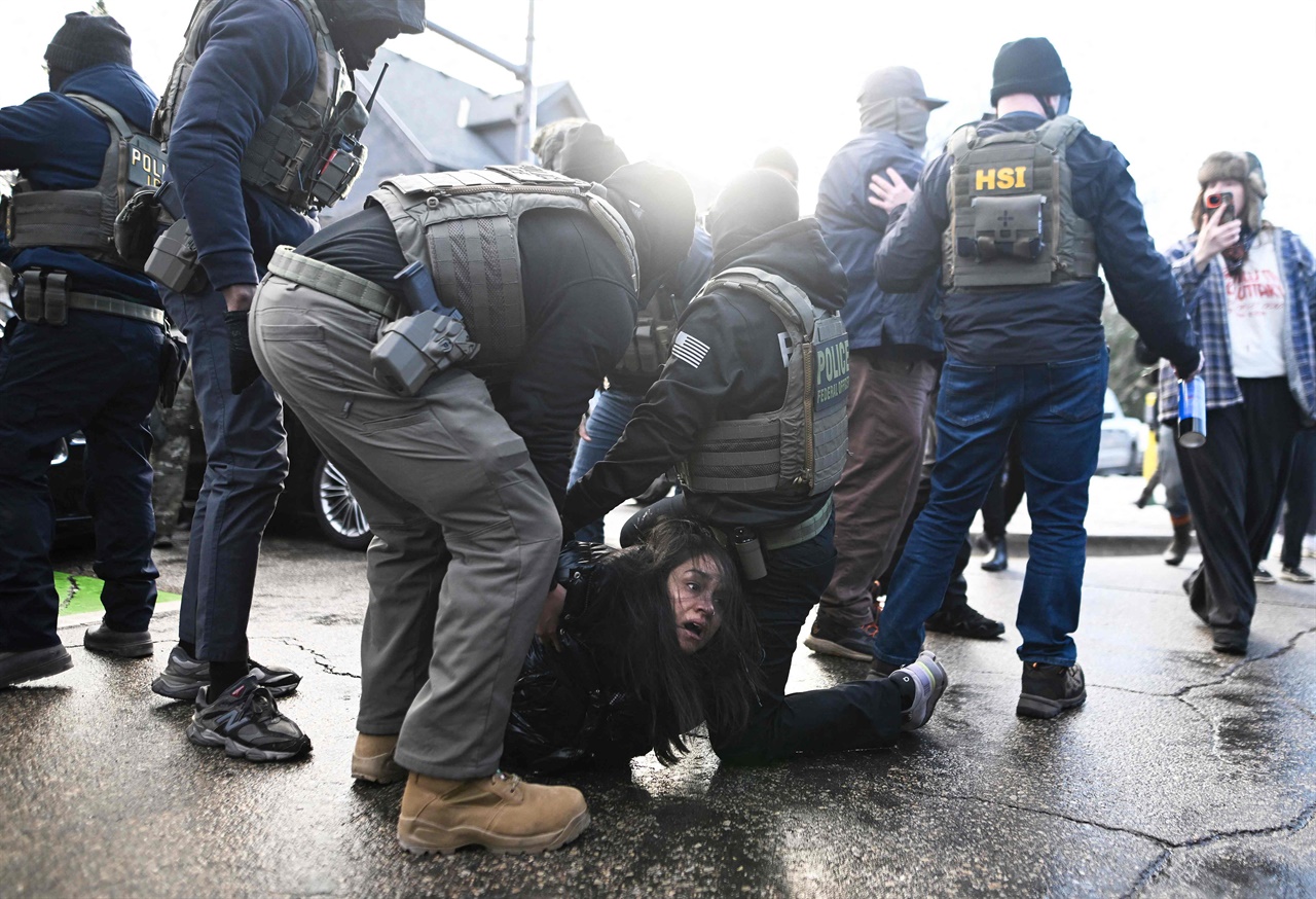 ¡ã¹Ì±¹ À̹μ¼°ü´Ü¼Ó±¹(ICE) ¿ä¿øµéÀÌ Áö³ 1¿ù 13ÀÏ ¹Ì³×¼ÒŸÁÖ ¹Ì´Ï¾ÖÆú¸®½º¿¡¼ ÇÑ ¿©¼ºÀ» üÆ÷Çϰí ÀÖ´Ù. ¨ÏAFP/¿¬ÇÕ´º½º