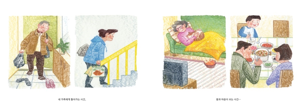 Ã¥ÀÇ ¹é¹Ì´Â ¹ö½º¿¡¼ ³»·Á ÁýÀ¸·Î ÇâÇÏ´Â »ç¶÷µé ¸ð½ÀÀ» Ç¥ÇöÇÑ Àå¸éÀÌ´Ù. û¼Ò¿øÀº ÇÑ ¼Õ¿¡ Åë´ß ÇÑ ¸¶¸®¸¦ µç ä ¹ß°ÉÀ½ÀÌ °¡º±°í, Á¾ÀÏ ¿ä¸®ÇÏ´ø Á¶¸®»ç´Â °í¾çÀÌ¿Í Ä§´ë¿¡¼ Æ÷±ÙÇÑ ¹ãÀ» ¸ÂÀÌÇÑ´Ù. »ï°¢±è¹ä°ú ÄŶó¸éÀ¸·Î ³¢´Ï¸¦ ¶§¿ì´ø Åùè±â»ç´Â µÈÀåÂî°³°¡ ³õÀÎ ½ÄŹ¿¡¼ °¡Á·°ú ÇǷθ¦ ³ìÀδÙ. °¢ÀÚ ¼ÒÁßÇÑ °ÍÀÌ µå·¯³ Àå¸é¿¡¼ ³ëµ¿ÀÚ´Â ÀÚ±â ÃëÇâ°ú ±âÈ£°¡ ÀÖ´Â ÀÔüÀûÀÎ Á¸Àç°¡ µÈ´Ù. À̵éÀº ÀÏÂï Àáµç´Ù. ´Ù½Ã, ùÂ÷¸¦ Ÿ±â À§ÇØ.