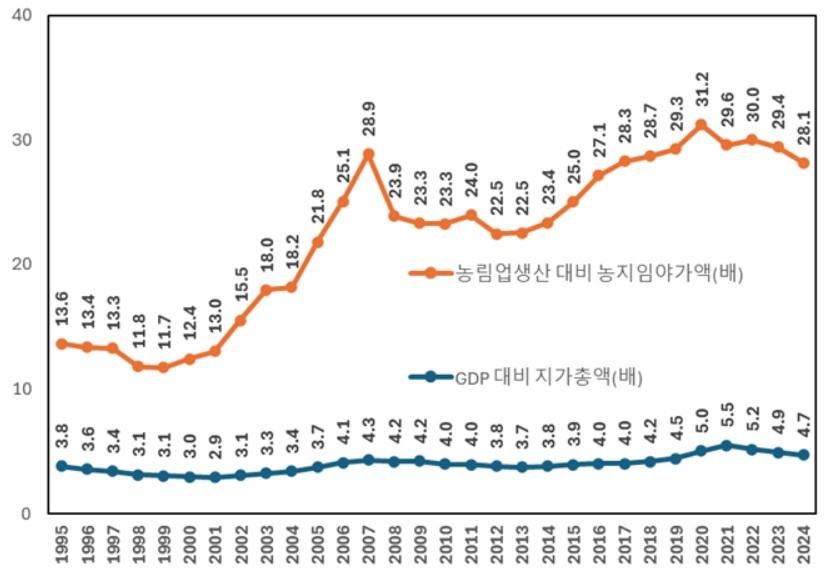 GDP ´ëºñ Áö°¡ÃÑ¾× ¹èÀ²°ú ³ó¸²¾÷ »ý»ê¾× ´ëºñ ³ó°æÁöÀӾ߰¡°Ý ¹èÀ²À» ºñ±³ÇÏ¸é ¿ì¸®°¡ ¿¹»óÇßµíÀÌ ³óÁö °¡°ÝÀÇ ºñ½Ñ Á¤µµ´Â, ´Ù½Ã ¸»Çؼ °ÅǰÀÌ ³¤ Á¤µµ´Â »ó»óÀ» ÃÊ¿ùÇÏ´Â ¼öÁØÀÓÀ» ¾Ë°Ô µÈ´Ù. »ç¿ë°¡Ä¡ÀÎ Áö´ë(ò¢ÓÛ)¿Í ±³È¯°¡Ä¡ÀÎ Áö°¡(ò¢Ê¤)ÀÇ ±«¸®°¡ °¡Àå ±Ø½ÉÇÑ ºÎµ¿»êÀÌ ¹Ù·Î ³óÁö¶ó´Â °ÍÀÌ´Ù.