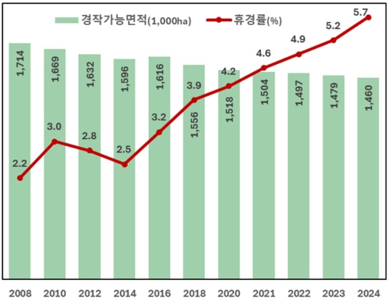 ±×·¯¸é ÈÞ°æÁö´Â ¾ó¸¶³ª µÉ±î? ¶Ç °æÀÛ °¡´É ¸éÀû¿¡¼ ÈÞ°æÁö°¡ Â÷ÁöÇÏ´Â ºñÁß ÃßÀÌ´Â ¾î¶³±î? ¾Æ·¡ <±×¸² 2>¸¦ º¸¸é ¿ì¸®³ª¶óÀÇ °æÀÛ °¡´É ¸éÀûÀº 2008³â 171¸¸ 3600§µ¿¡¼ 2024³â 146¸¸ 1000§µ·Î 16³â ¸¸¿¡ ¹«·Á 25¸¸ 3400ha³ª ÁÙ¾îµç ¹Ý¸é, ÈÞ°æ¸éÀûÀº ¿ÀÈ÷·Á 4¸¸ 4700ha°¡ ´Ã¾ú´Ù. ¸¸¾à ÈÞ°æ·üÀÌ ÀÏÁ¤Çϸé ÈÞ°æ¸éÀûµµ °æÀÛ °¡´É ¸éÀûÀÌ ÁÙ¾îµå´Â °Í¿¡ ºñ·ÊÇØ¼ ÁÙ¾îµé¾î¾ß ÇÔ¿¡µµ, ¿ÀÈ÷·Á ´Ã¾ú´Ù. ±×·± ±î´ß¿¡ ÈÞ°æ·üÀº 2008³â 2.2%¿¡¼ 2024³â 5.7%·Î, ¹«·Á 2.6¹è³ª ´Â °ÍÀÌ´Ù.