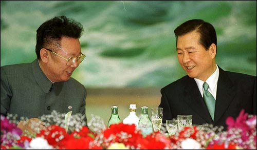 ¡ã Áö³ 2000³â 6¿ù ³²ºÏÁ¤»óȸ´ã ´ç½Ã Æò¾ç½Ã³» ¸ñ¶õ°ü¿¡¼ ¸¸ÂùÀ» Çϰí ÀÖ´Â ±è´ëÁß ´ëÅë·É°ú ºÏÇÑ ±èÁ¤ÀÏ ±¹¹æÀ§¿øÀå. ±×·ÎºÎÅÍ ¹ú½á 6³âÀ̶ó´Â ¼¼¿ùÀÌ Èê·¶´Ù.